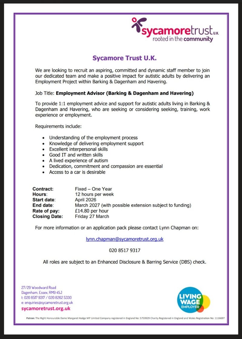 We are looking to recruit an aspiring, committed and dynamic staff member to join our dedicated team and make a positive impact for autistic adults by delivering an Employment Project within Barking & Dagenham and Havering.